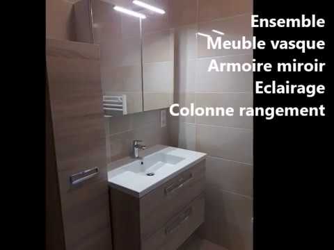 Salle de bain : douche à receveur plat, colonne de douche avec pomme de tête, banc de douche, parois vitrée, sèche serviette, meuble vasque à 2 tiroirs, colonne de rangement assortie, armoire miroir avec éclairage Led, pièce entièrement faïencée.